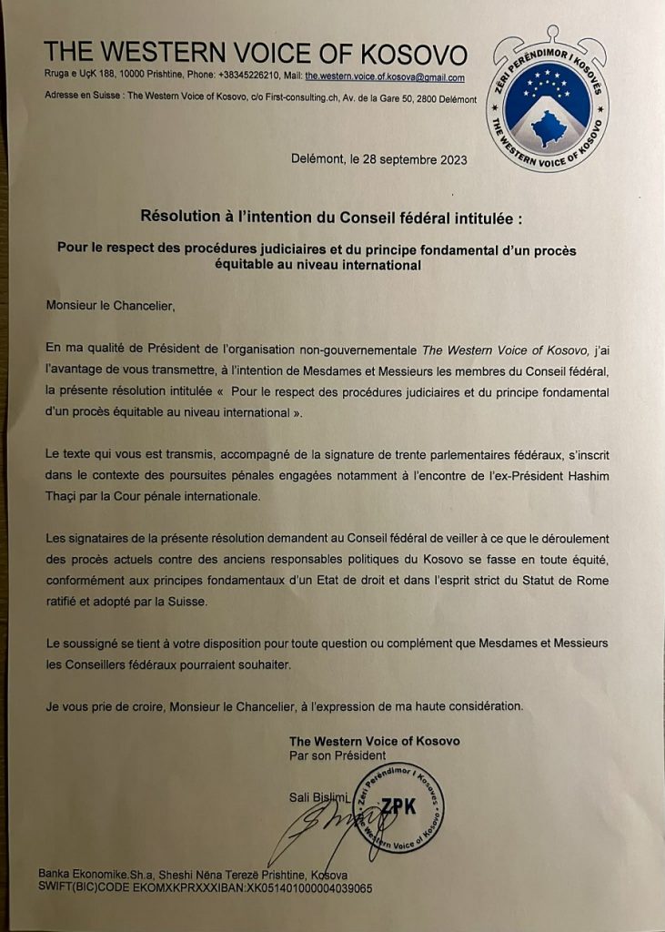 KosovaPress ka siguruar rezolutën e nënshkruar nga 30 deputetë zviceranë, të cilën sot (e hënë), prej orës 11:00 do ta dorëzojë aktivisti Sali Bislimi në Gjykatën Speciale.