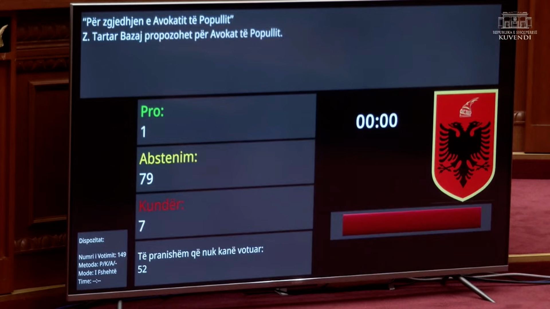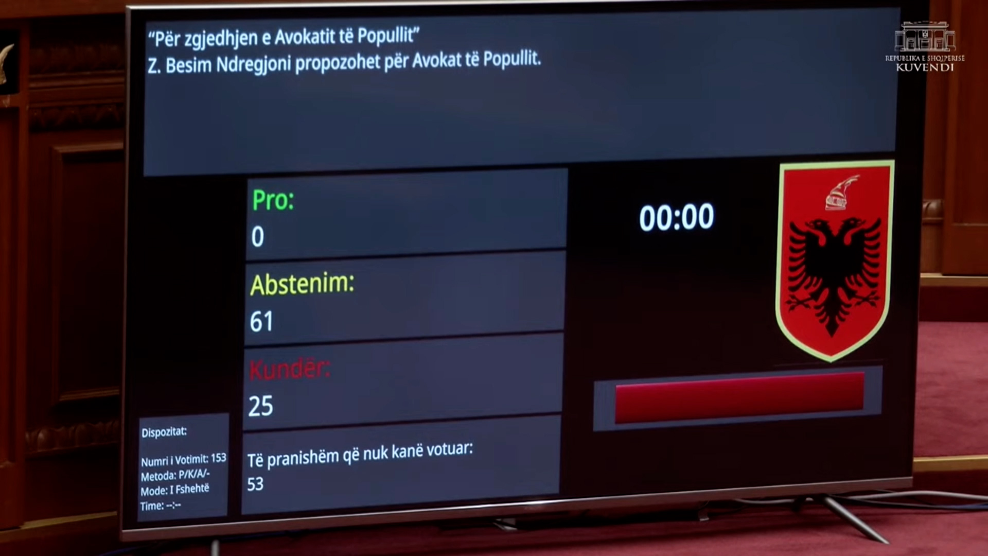 Ashtu siç Report Tv mësoi, Endri Shabani u zgjodh Avokat i Popullit, me 85 vota pro, 82 të Partisë Socialiste dhe 3 të Partisë Socialdemokrate. Më poshtë ju sjellim votimet për të 6 kandidaturat e propozuara nga opozita, pavarësisht se kjo e fundit braktisi sallën në momentin e votimit.