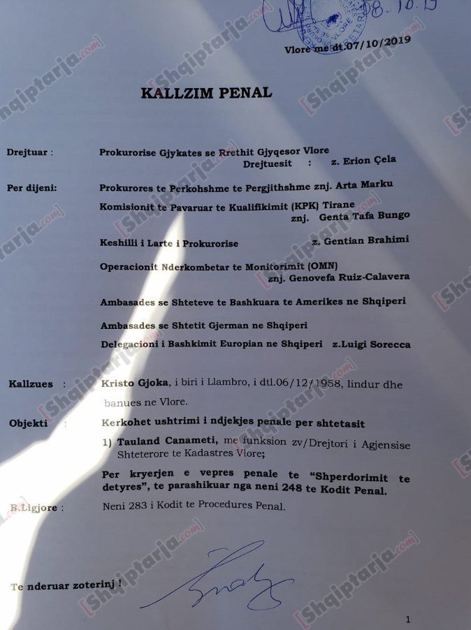 Vendimi i pezullimit dhe përplasja që mendoj unë të jetë e drejtoreshës së dorëhequr sot është se për çudi na ka ardhur nëndrejtor Taulant Canameti. Drejtor i agjencisë së Kadastrës Vlorë i cili vjen me 8 badigardë në Vlorë. I kemi planet e filmuara. Një nëpunës shteti me një rrogë 400 mijë lekë të vjetra vjen me 8 badigardë në Vlorë dhe gjen mundësinë para 3-4 ditësh ku drejtoresha ka qenë në Tiranë dhe merr një vendim të jashtëligjshëm. Ne për këtë i jemi drejtuar prokurorisë për zotin Taulant me akuzën shpërdorim detyre. I cili ka dhënë një urdhër të paligjshëm.