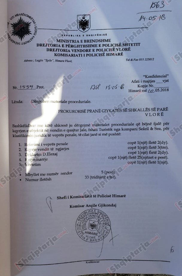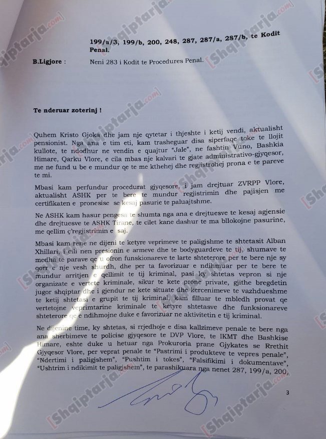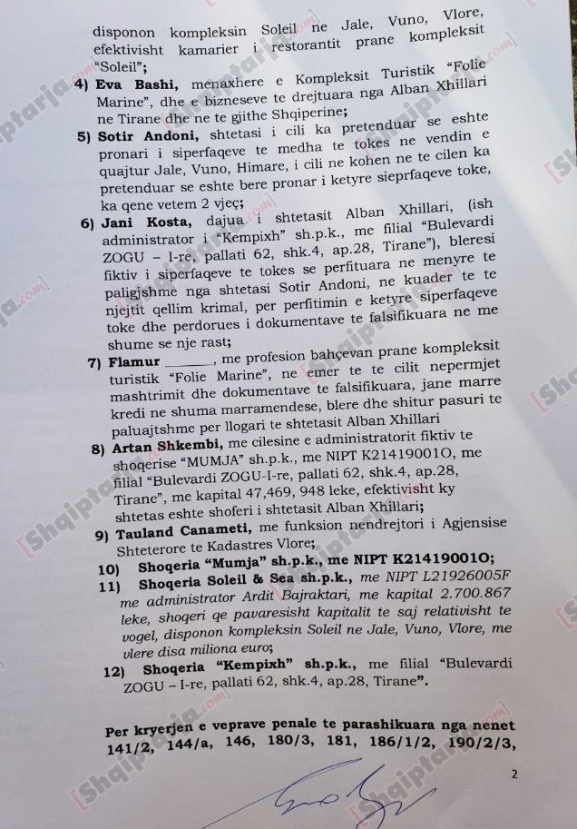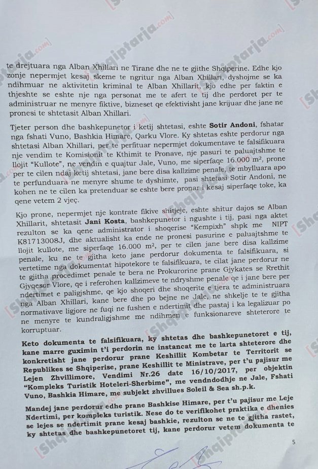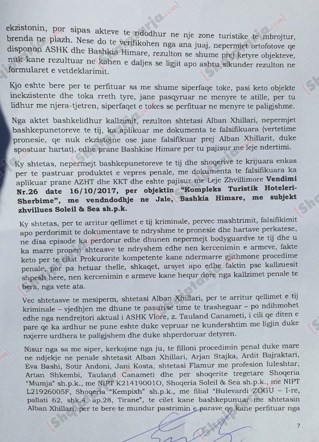 Po këtë të martë avokati Geron Gunbardhi, shoqëruar edhe nga pronari i ligjshëm i pronës në Jalë, Kristo Gjoka shprehet se në lidhje me këtë çështje kanë bërë një kallëzim penal në prokurorin e rrethit gjyqësor Vlorë, ndaj 12 personave, të cilët sipas tij pretendojnë të marrin pronën prej 1.6 hektarë në zonën e Jalës, duke përmendur emrin e Alban Xhillari. Sipas Gunbardhit, Xhillari me dokumente false ka zaptuar tokën.