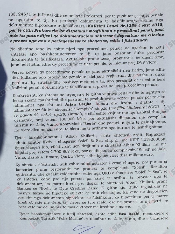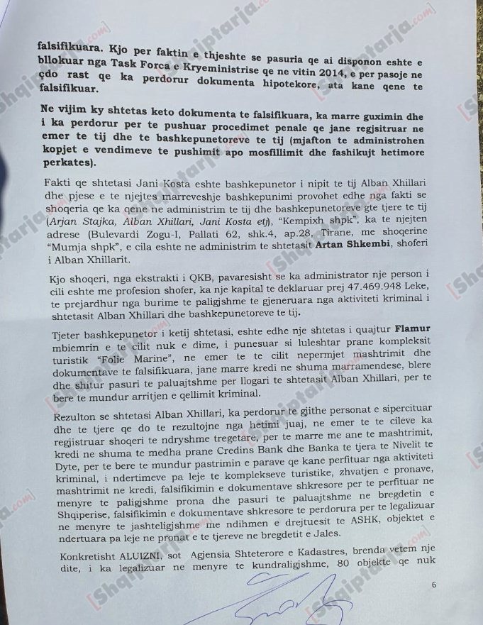 Të gjithë këto dokumente ja vumë në dispozicion prokurorisë me shpresëm se do ti bashkojnë të gjitha kallëzimet penale në një të vetëm dhe të zbardhet e vërteta. Kush është Alban Xhillari, kush fshihet pas Alban Xhillarit. Pas kësaj ne presim të përgatisim dosjen. Ne presim që të filloje SPSK-u dhe të gjithë personat të instancave shumë të larta kanë firmosur tek kjo dosje zhvillimore të pronës në Jalë. Me dokumenta fallco të rrëzuara nga gjykata e Apelit dhe kanë guxuar që të ja çojnë kryeministrit.