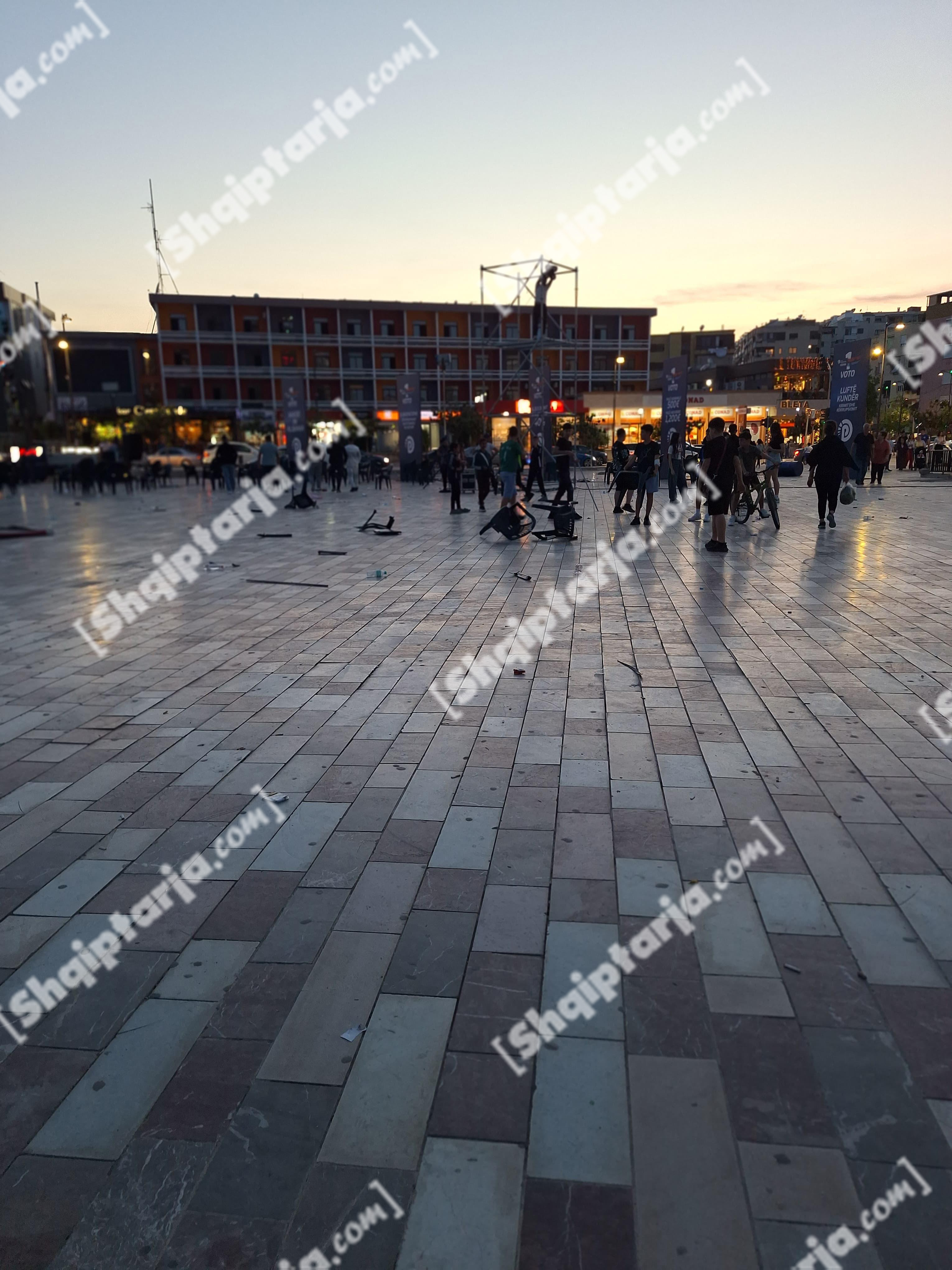 Kjo ishte gjendja e sheshit qendror të Fierit pas tubimit përmbyllës elektoral të Partisë Demokratike. Mbeturina kudo, karrige të rrëzuara dhe rrëmujë.