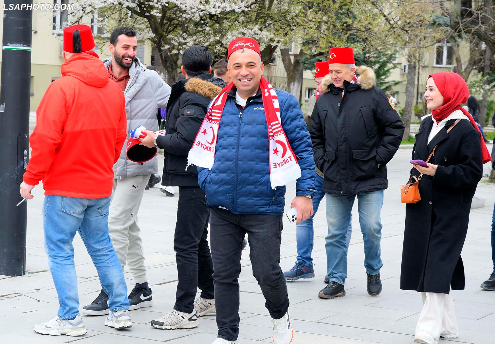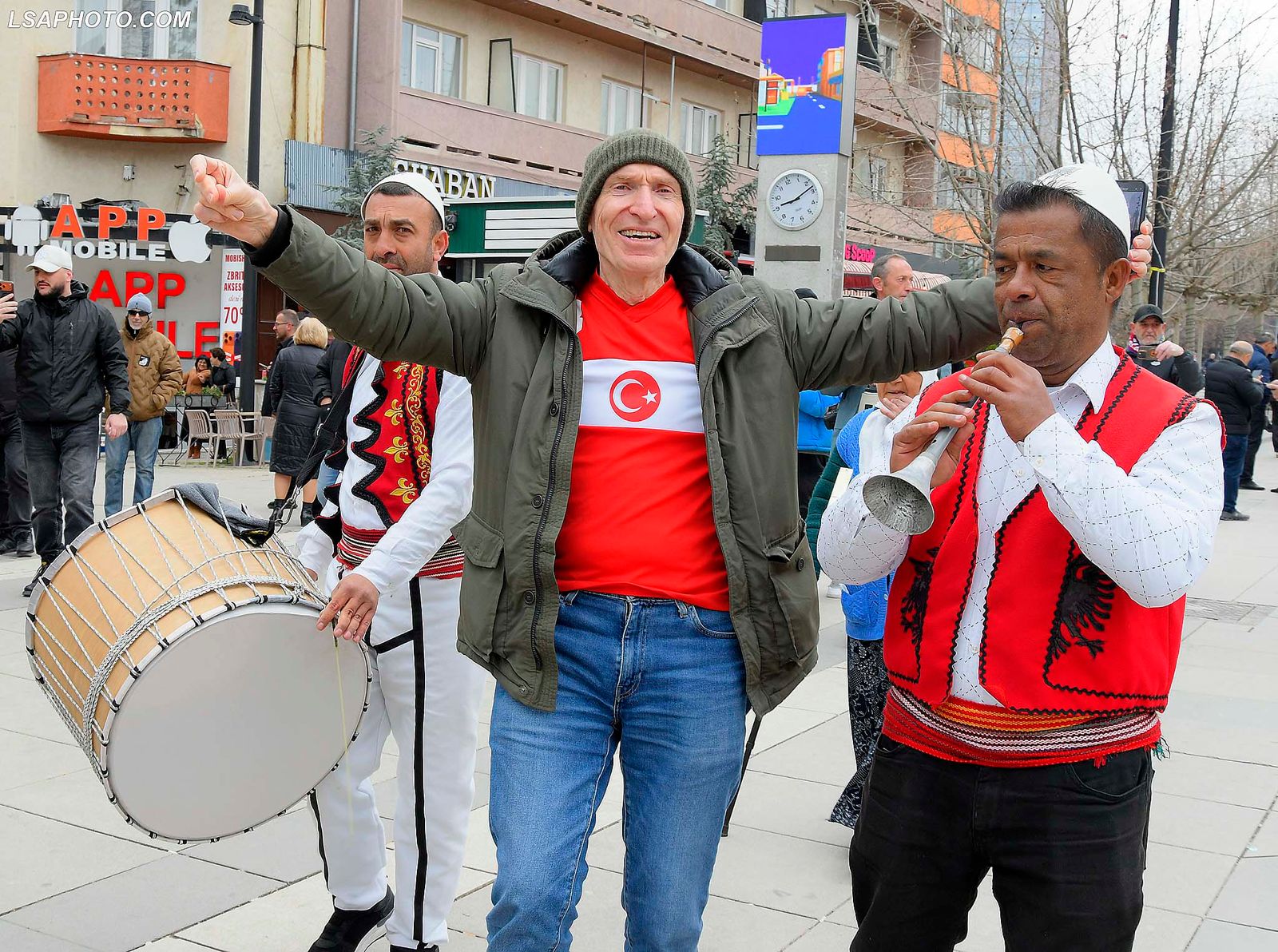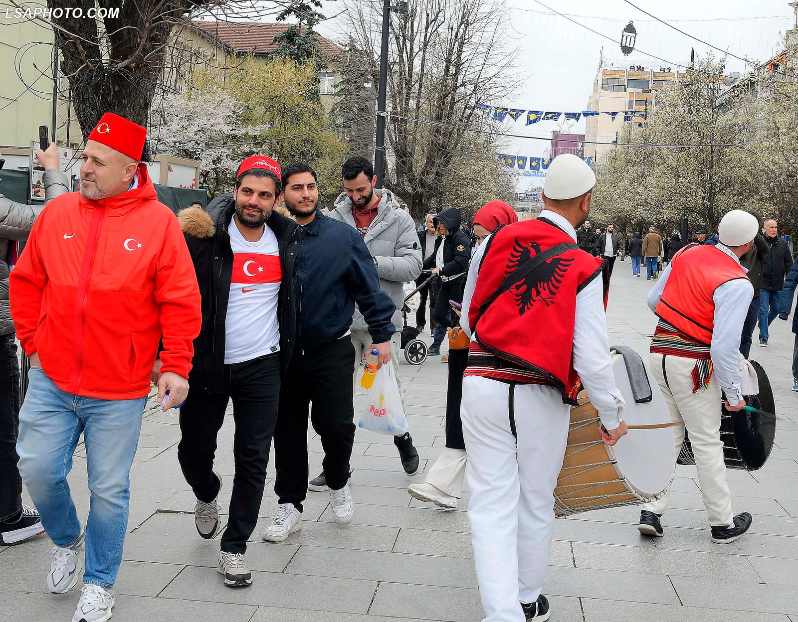 Me veshje tradicionale, flamurin kombëtar dhe tupana! Shqiptarët 'ndezin' Prishtinën, me ta bashkohen edhe tifozët turq