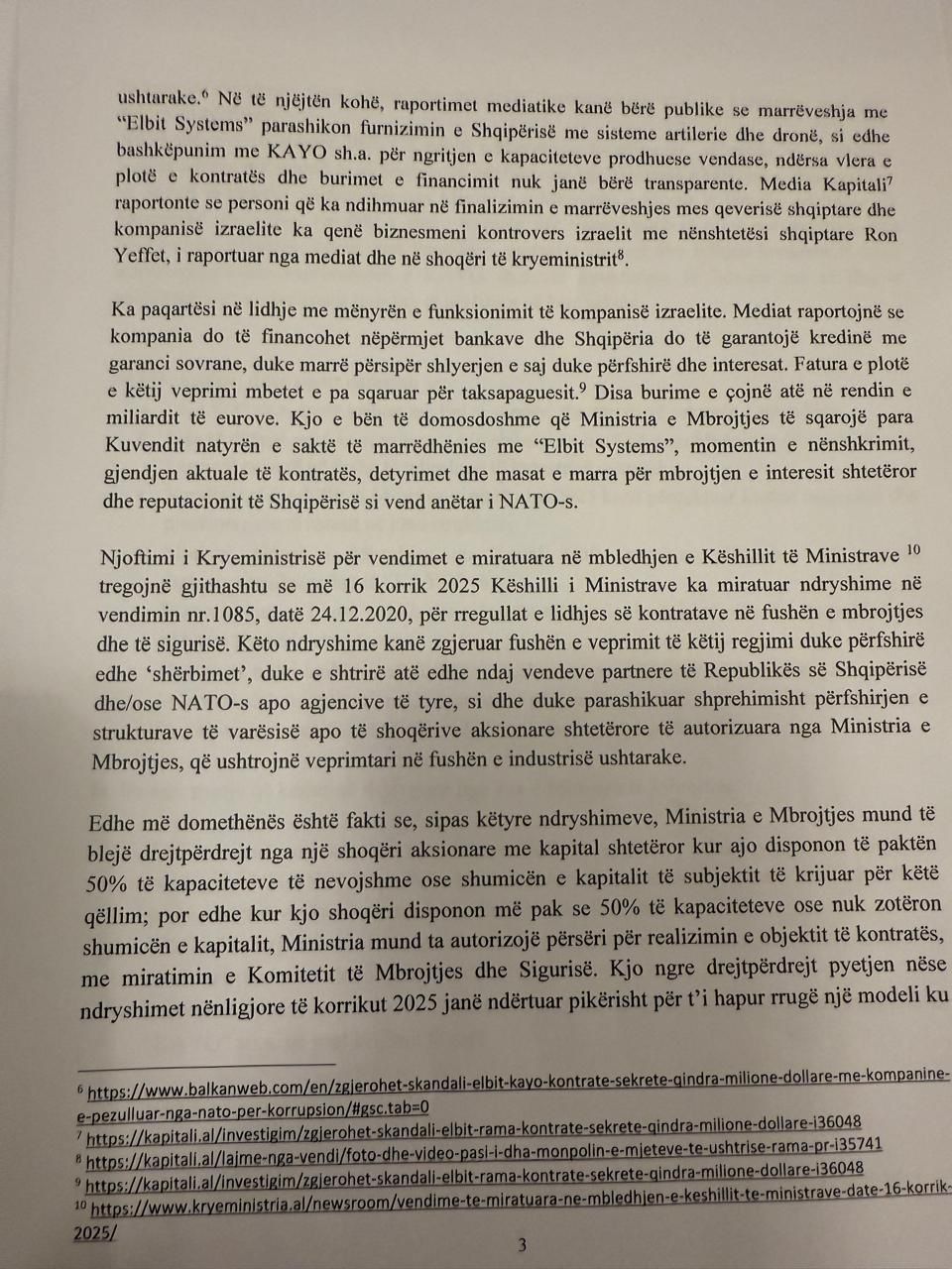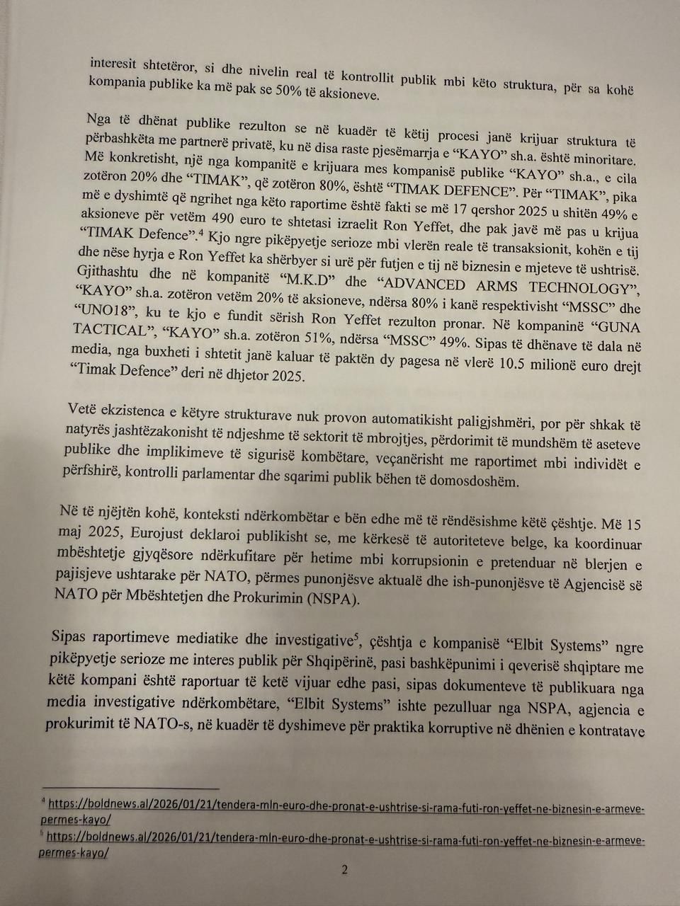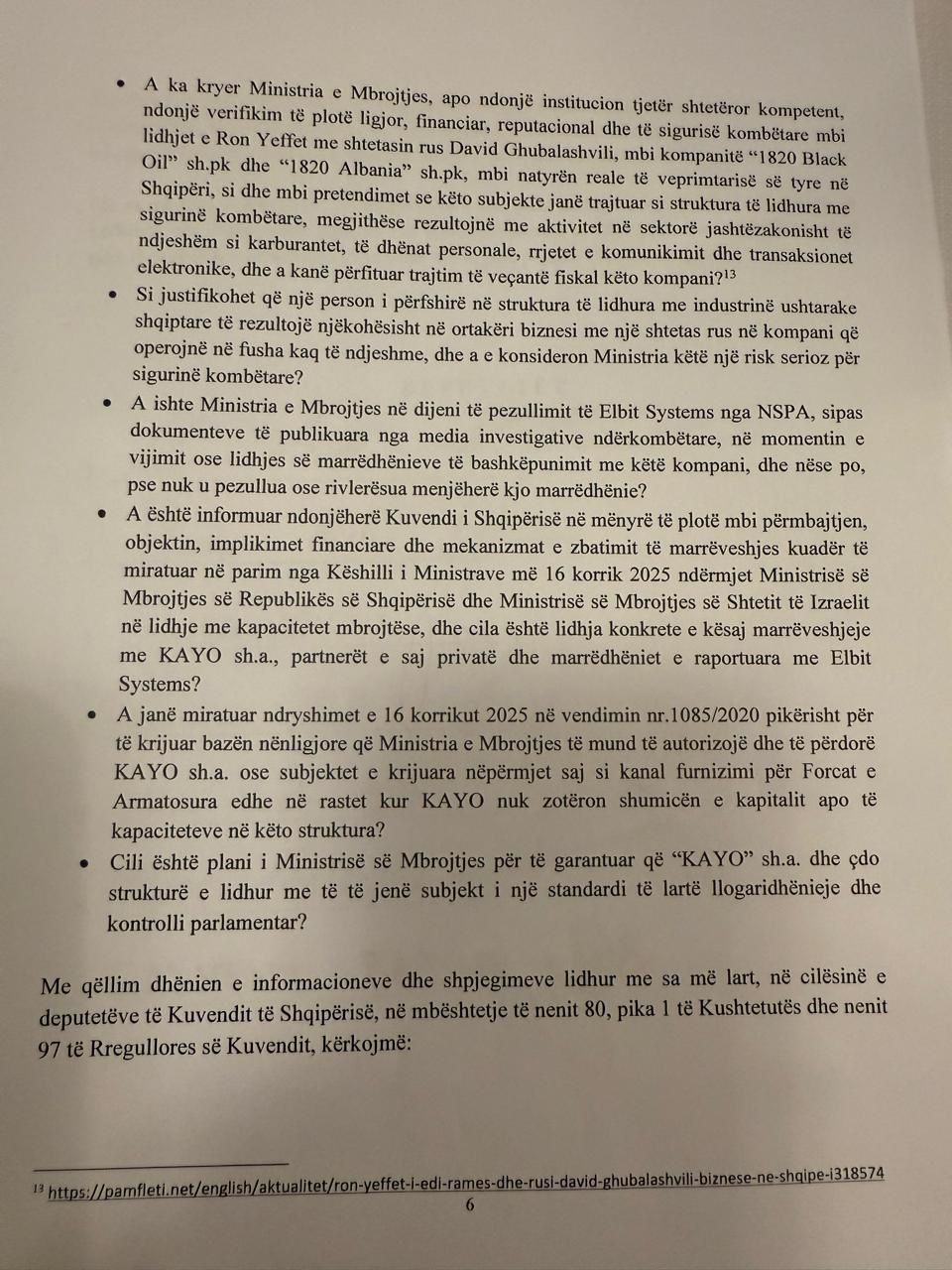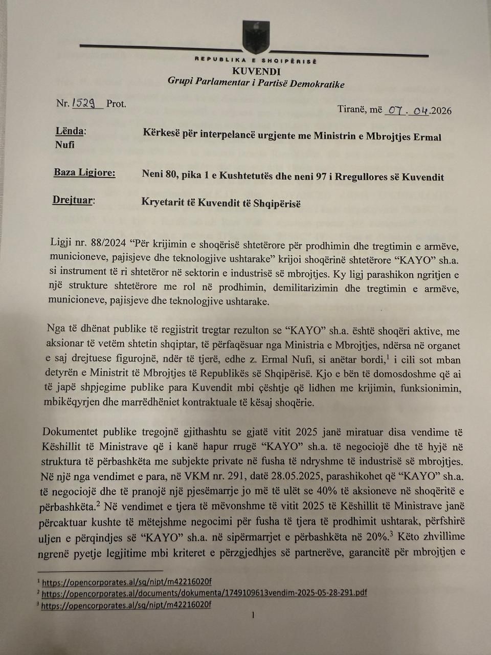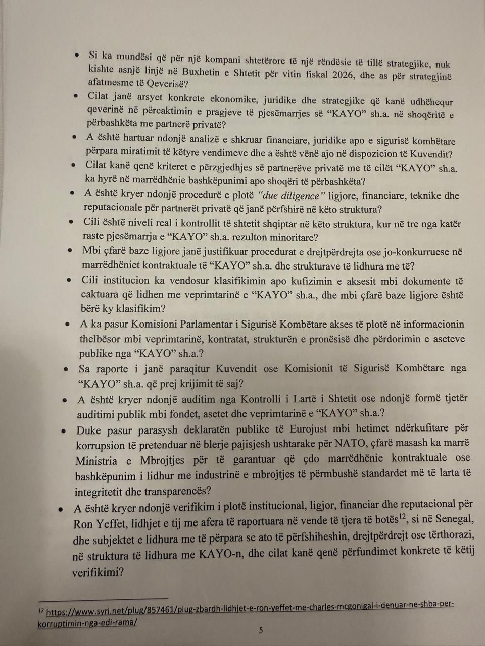 Kërkesa drejtuar Peleshit është firmosur nga 7 deputetë të Partisë Demokratike, përfshi kreun e Grupit Parlamentar. PD kërkon sqarime mbi funksionimin dhe marrëdhëniet kontraktuale të kompanisë 'KAYO'