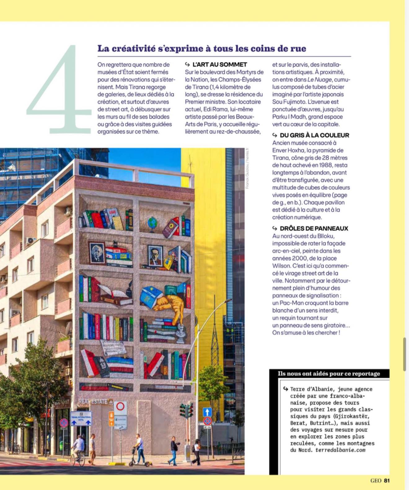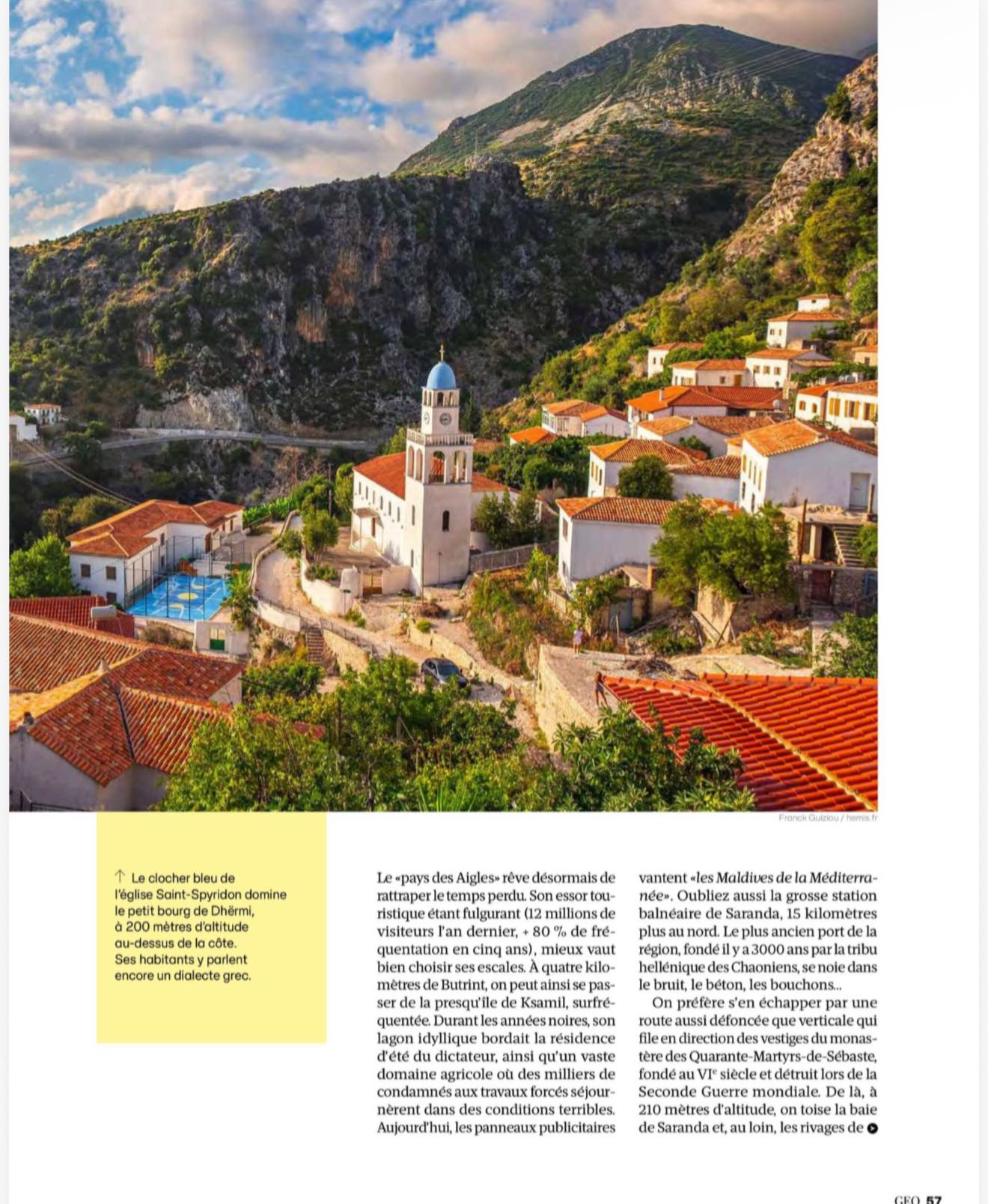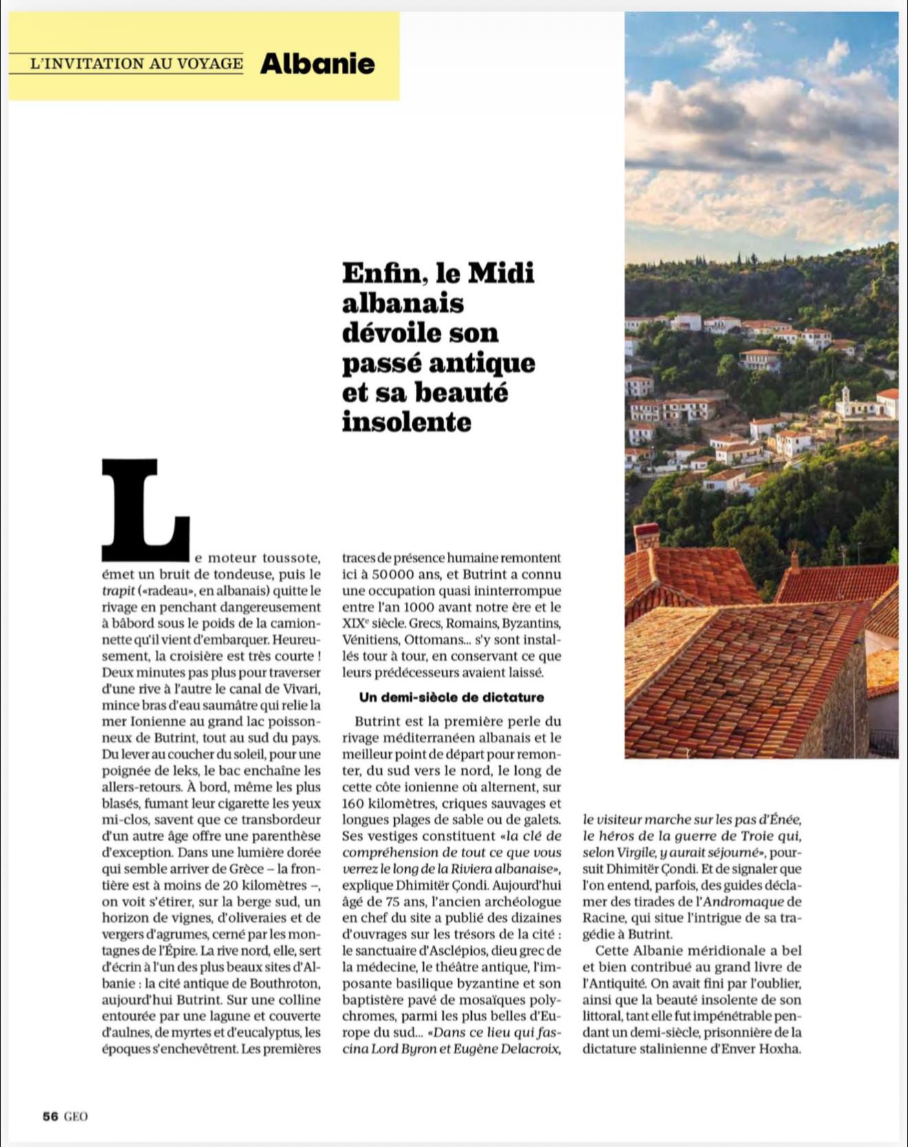 GEO Magazine ka shkruar një artikull për Shqipërinë turistike duke u ndalur në disa qytete e tradita. Në “tokën e shqiponjave”, artikulli shëtit nga metropoli i Tiranës drejt Beratit, Gjirokastrës, rivierës, te Alpet krenare dhe historia e kultura që përbëjnë “perlën e Mesdheut”. Gjithashtu flet edhe për rritjen eksponenciale turistike të viteve të fundit.