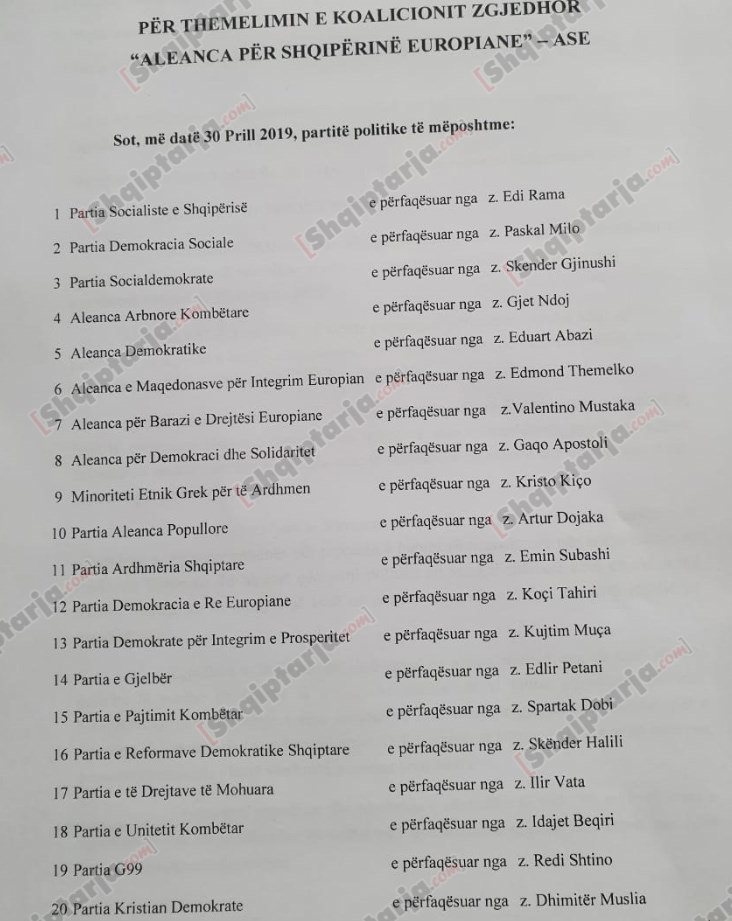 Partia Socialiste do të shkojë në zgjedhjet e 30 qershorit në koalicion. Mesditën e sotme sekretari i Përgjithshëm i PS, Taulant Balla ka zhvilluar një takim, ku është firmosur marrëveshja me 24 parti aleate, si Skënder Gjinushi, Paskal Milos, Kiço Tahiri etj. Ky koalicion do të njihet si "Aleanca për Shqipërinë Europiane", por ndryshe nga 2015, nuk do të identifikohet si "ASHE", por "ASE".