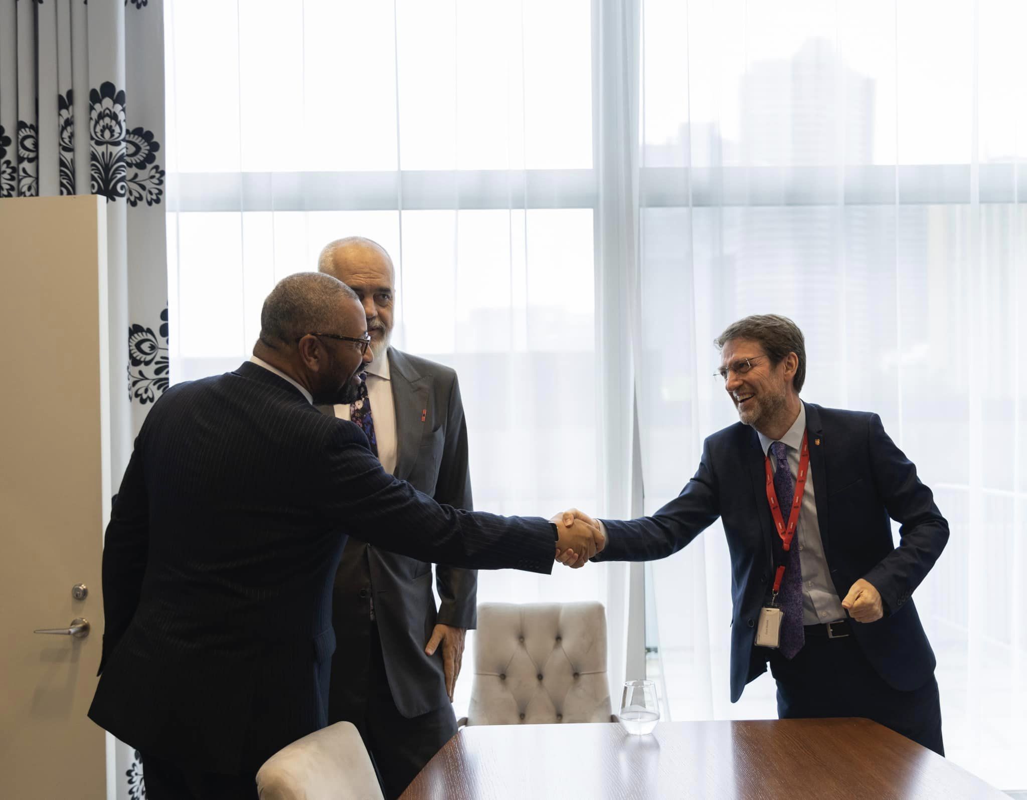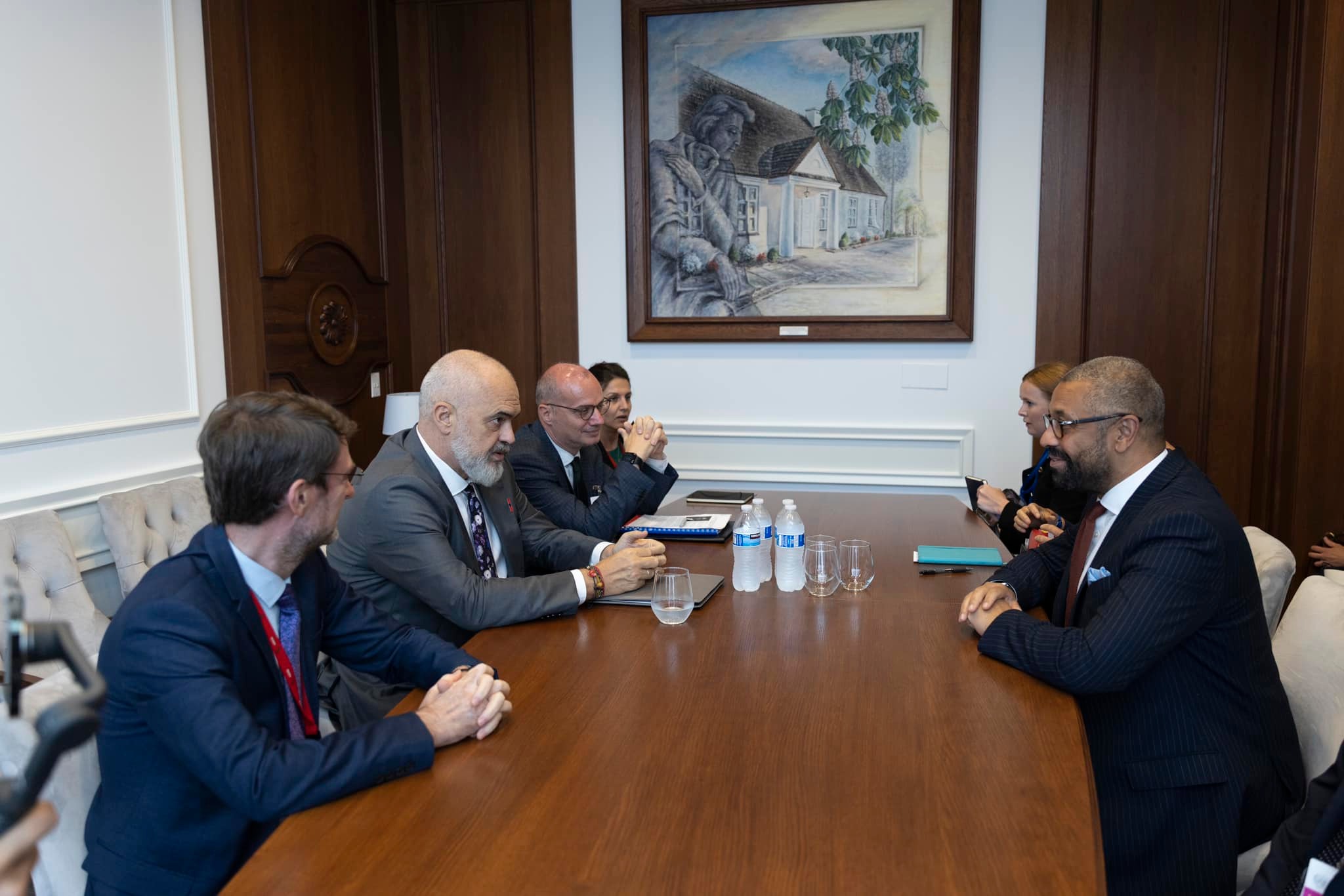 Në New York ku ndodhet në kuadër të mbledhjes së Asamblesë së Përgjithshme të Kombeve të Bashkuara, pasi Shqipëria kryeson Këshillin e Sigurisë në OKB, kryeministri Edi Rama ka takuar ministrin e Jashtëm britanik James Cleverly