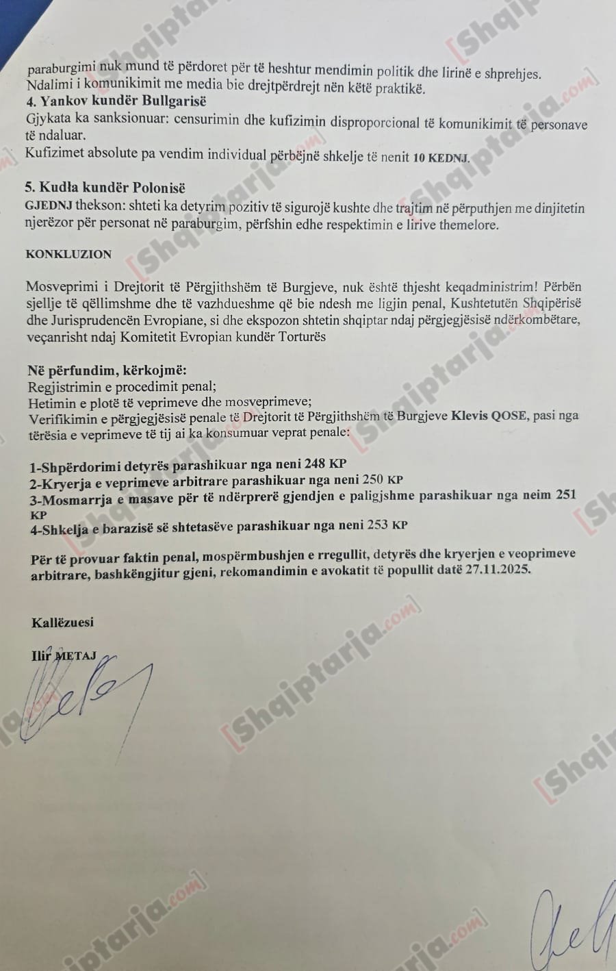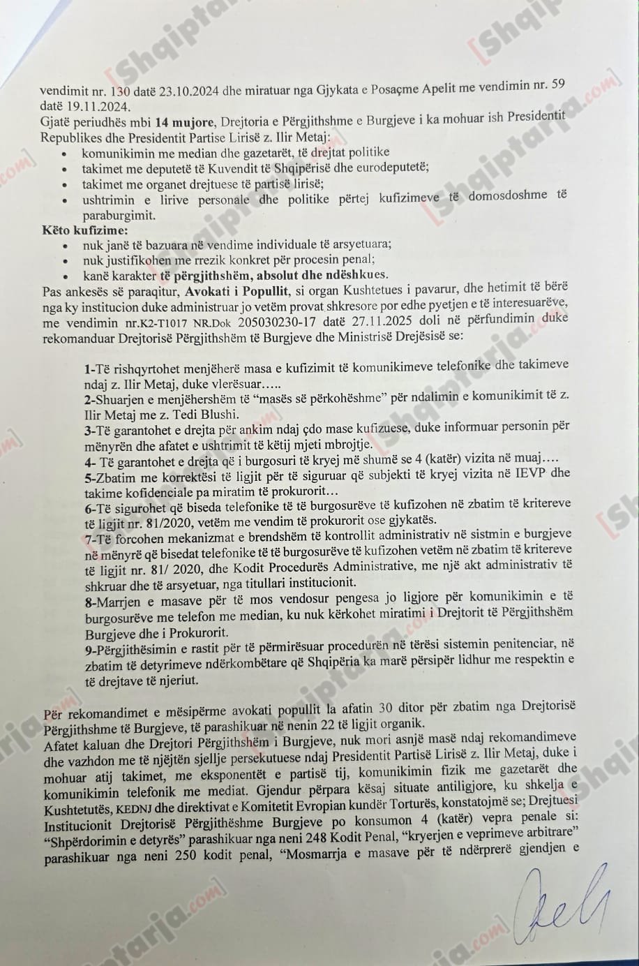 Ish-presidenti Ilir Meta ka kallëzuar penalisht drejtorin e Drejtorisë së Përgjithshëm të Burgjeve, Klevis Qose, duke pretenduar se ky i fundit i ka mohuar ushtrimin e lirive personale dhe politike përtej kufizimeve të domosdoshme të paraburgimit.