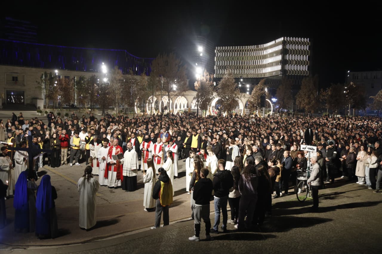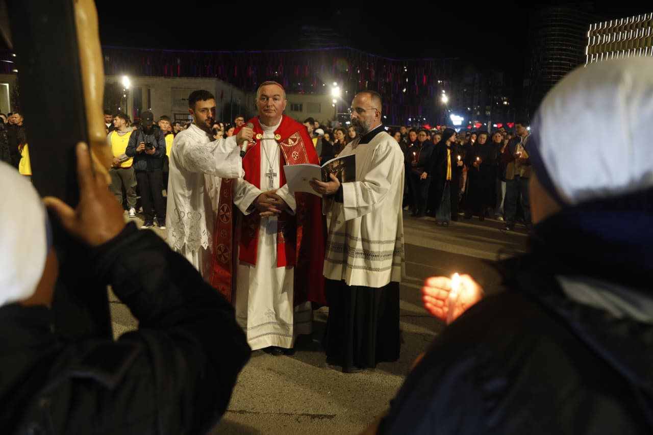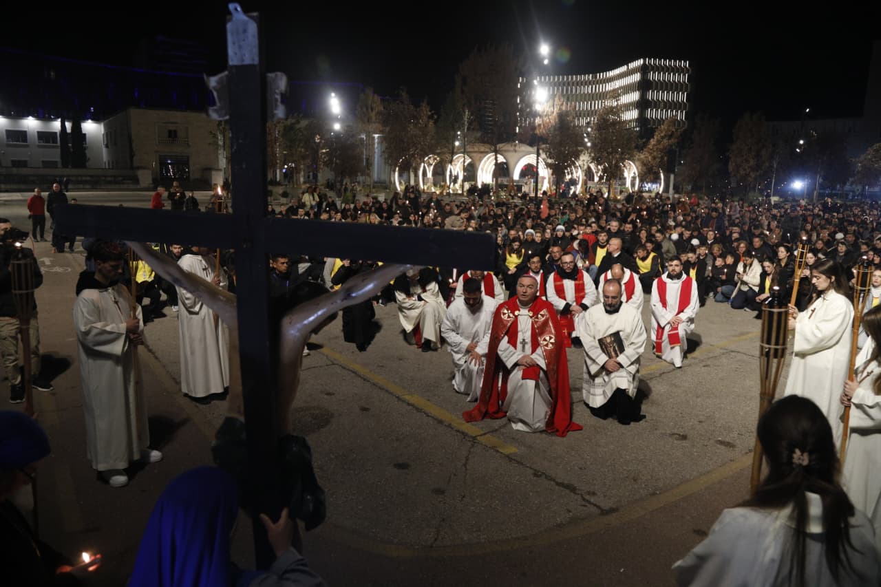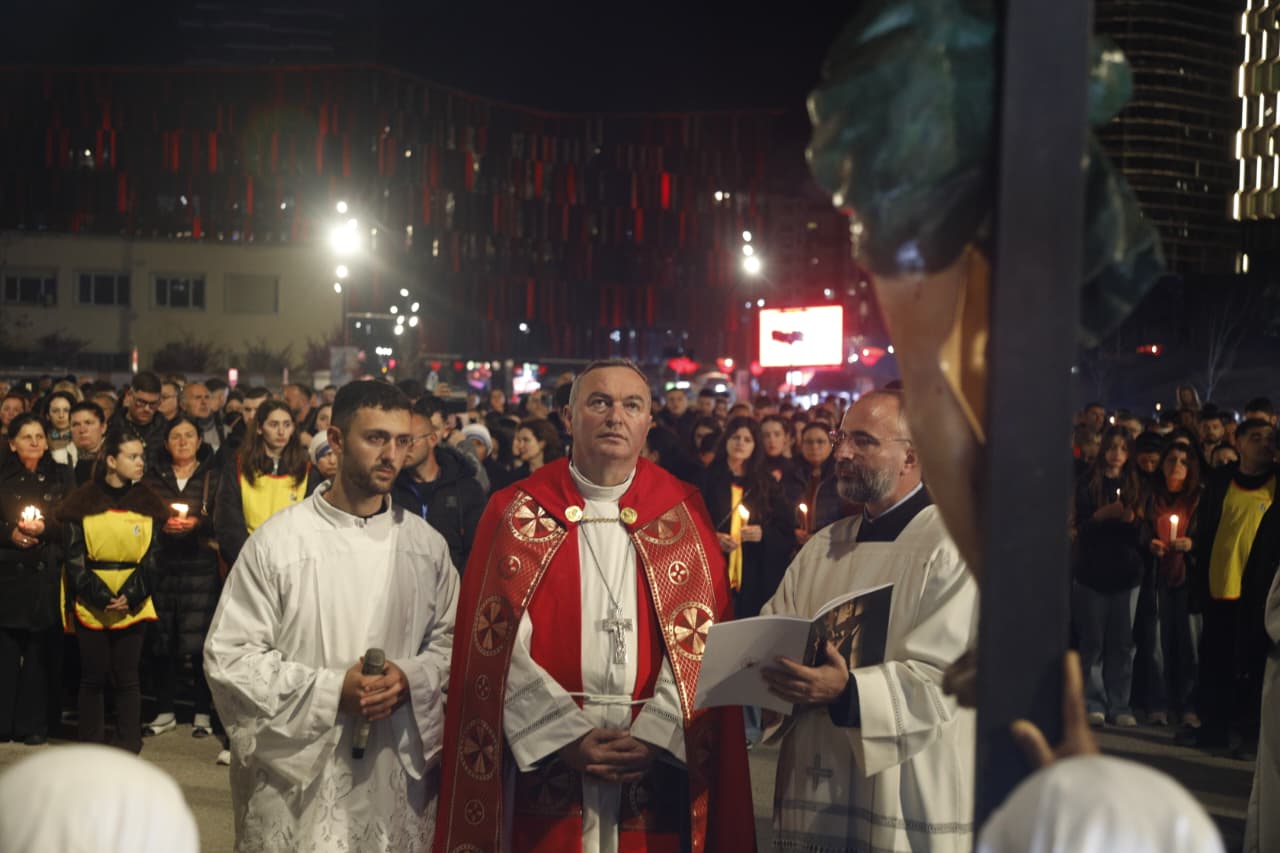 Qindra besimtarë katolikë u mblodhën në sheshin nënë Tereza në Tiranë për të kremtuar një nga ritet tradicionale në prag të Pashkës, Udhën e Kryqit, duke ndjekur 14 ndalesat që përkujtojnë mundimet e Jezu Krishtit drejt kryqëzimit. Imzot Arjan Dodaj foli për rëndësinë e reflektimit, solidaritetit dhe afrimit me njëri tjetrin.