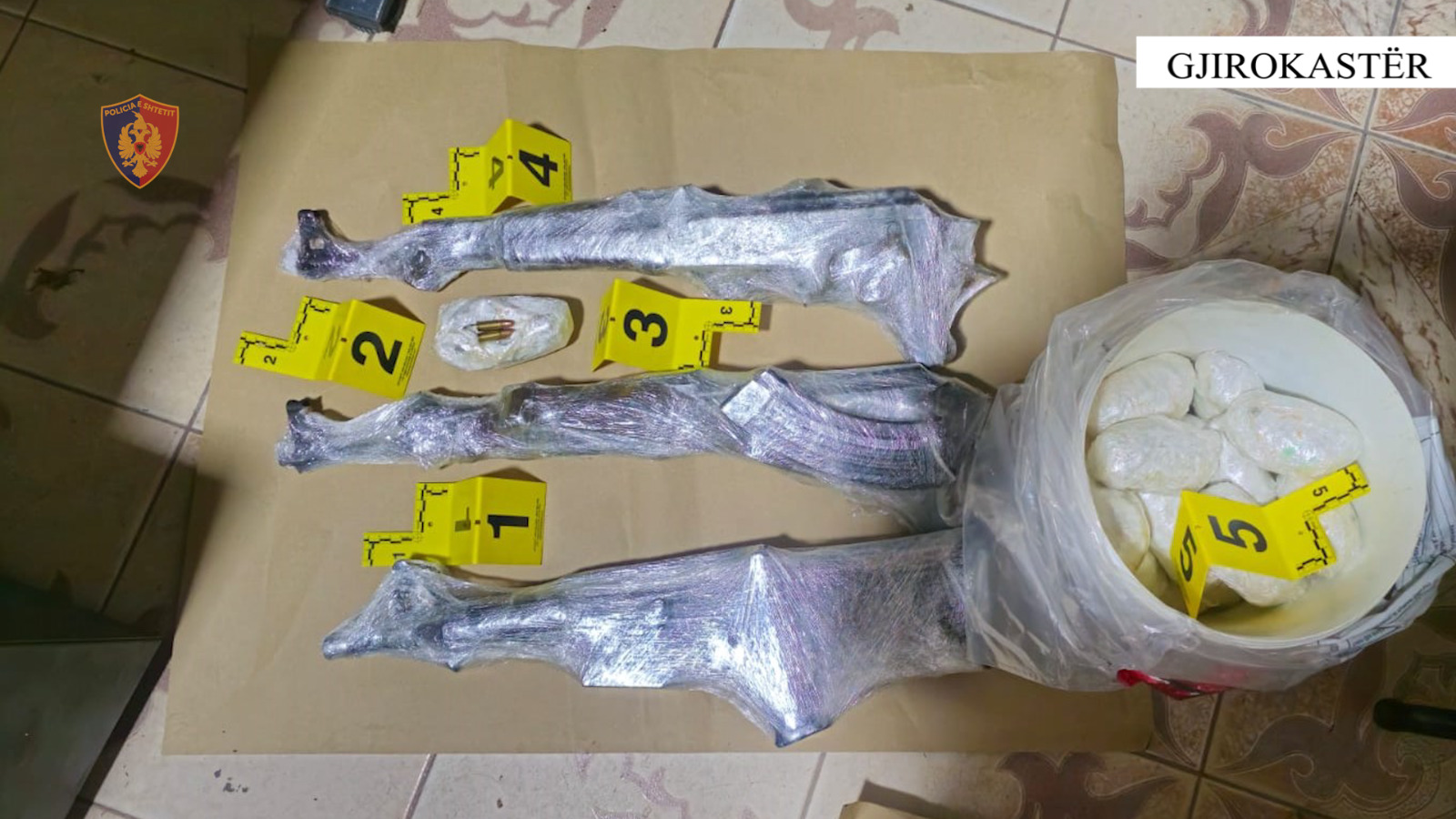Gjatë kontrolleve në banesat e disa shtetasve shqiptarë të dyshuar si vrasës me pagesë në Gjirokastër, Vlorë dhe Lezhë, u sekuestruan 3 armë zjarri automatike, 200 fishekë kallashnikovi, 18 pako me fishekë pistolete dhe 5 krehra.