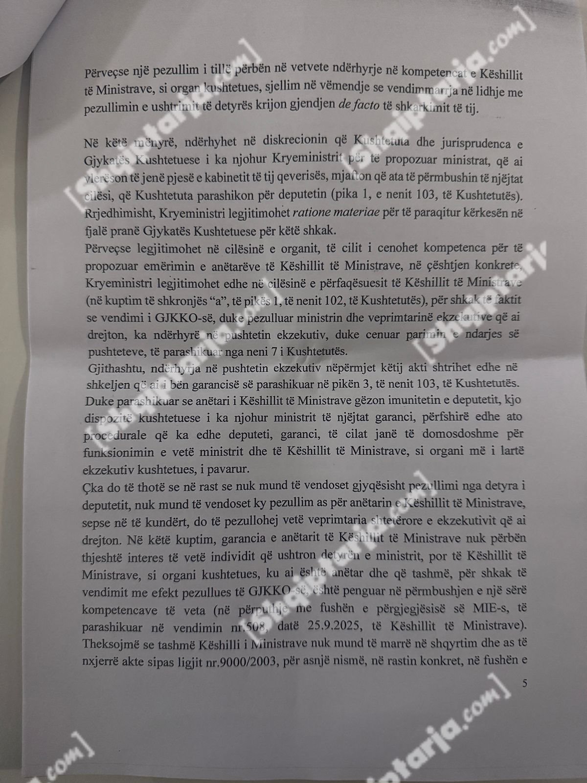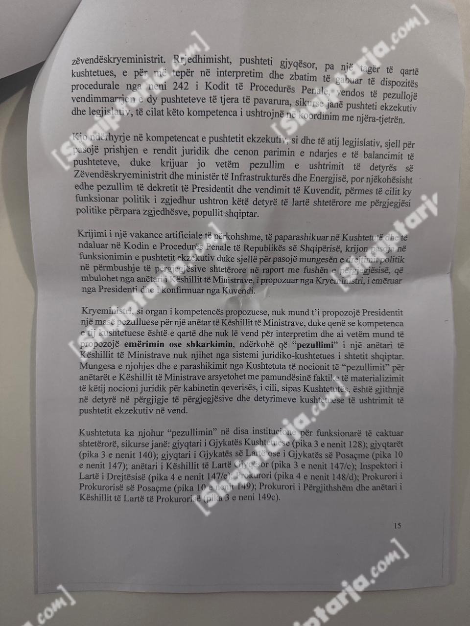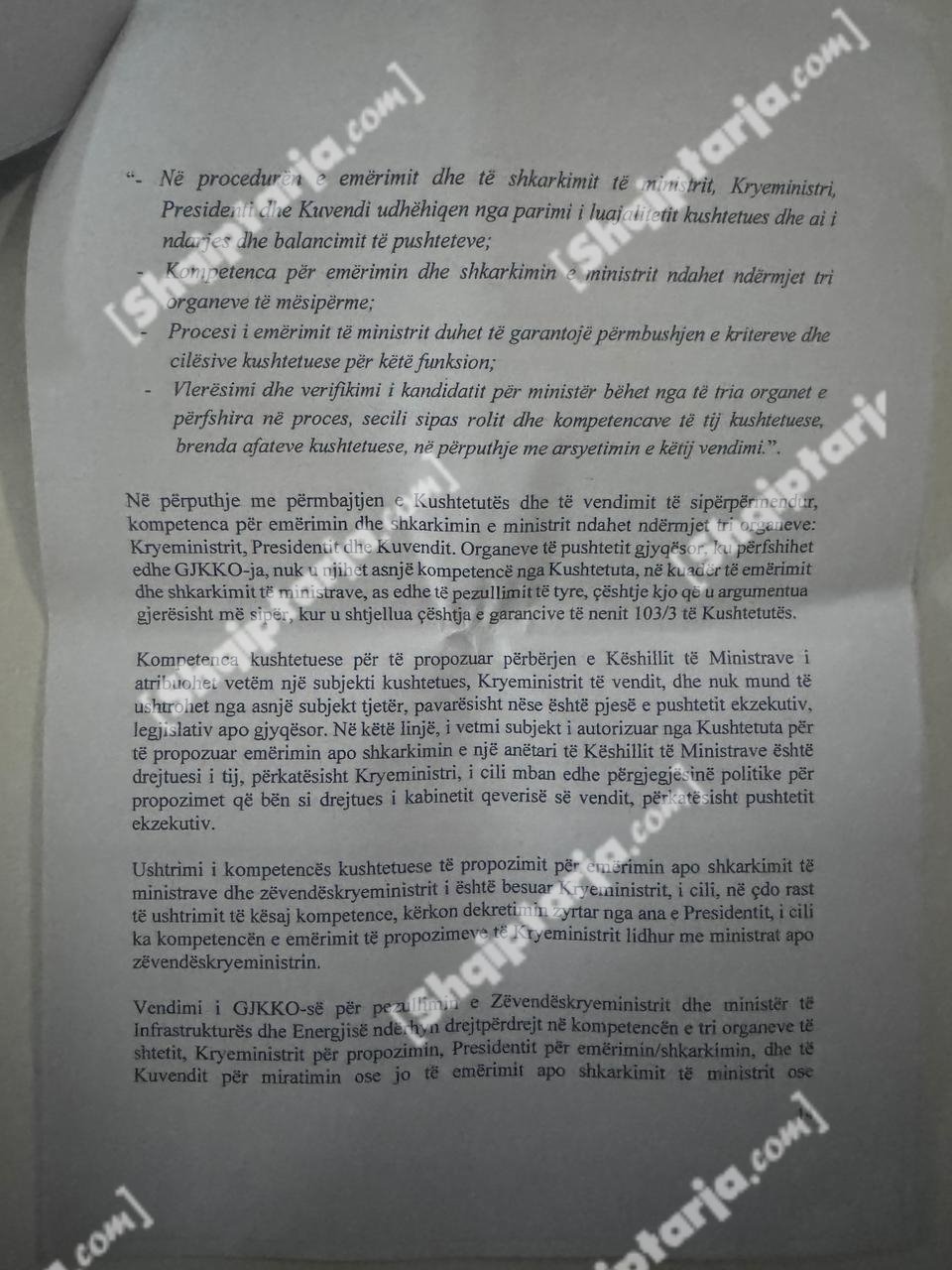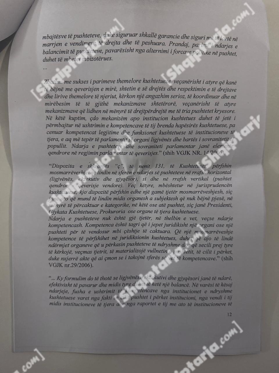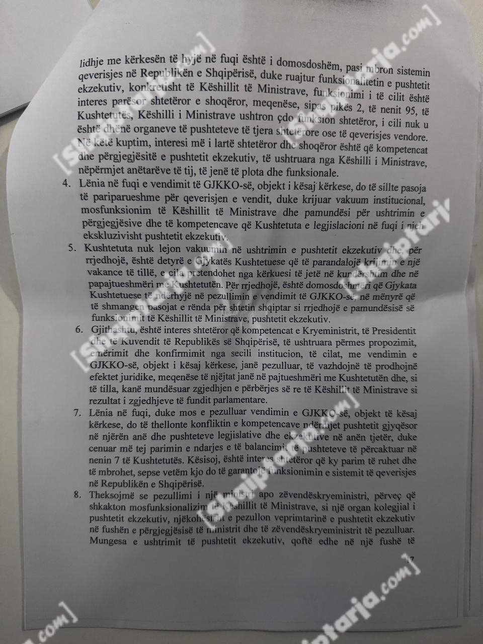 Qeveria argumenton se ky vendim cenon kompetencat e tre institucioneve kushtetuese: Kryeministrit, Presidentit dhe Kuvendit.