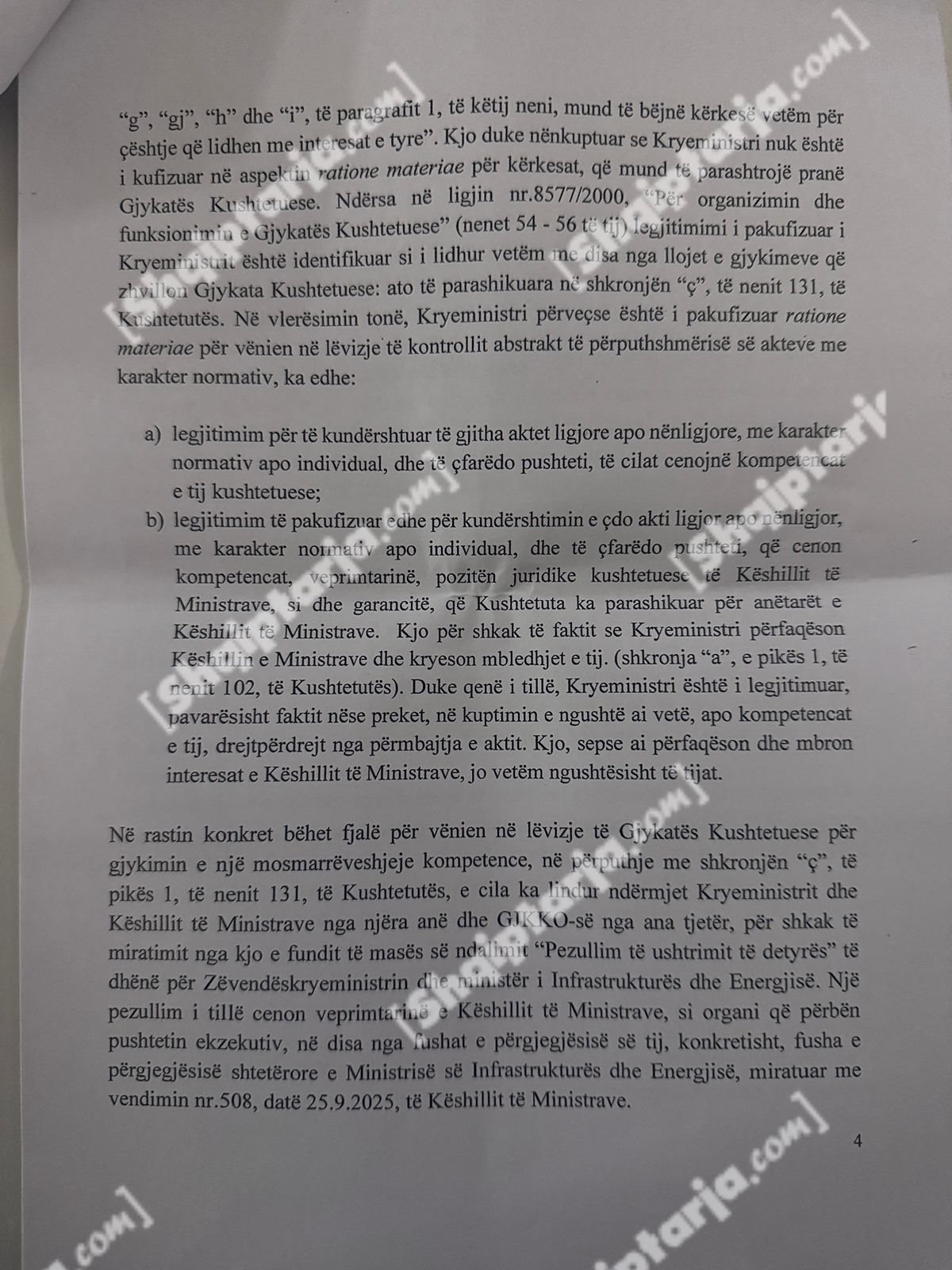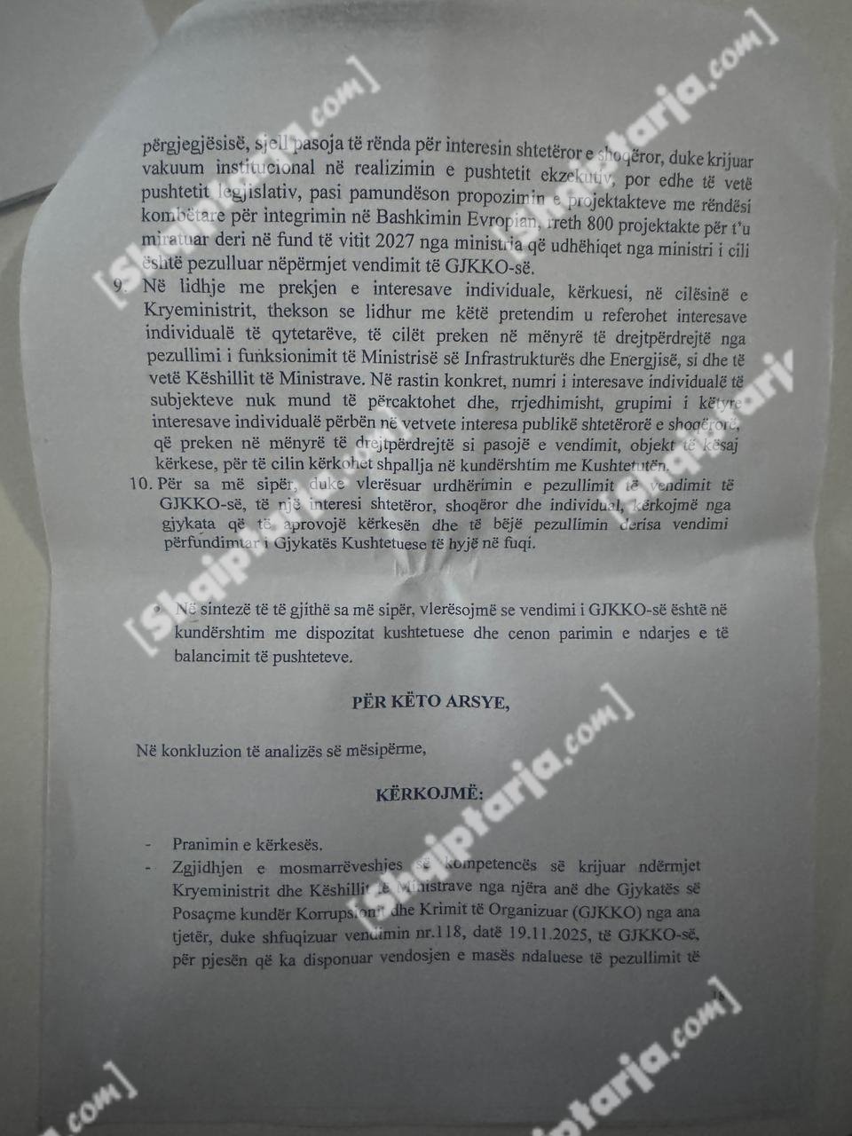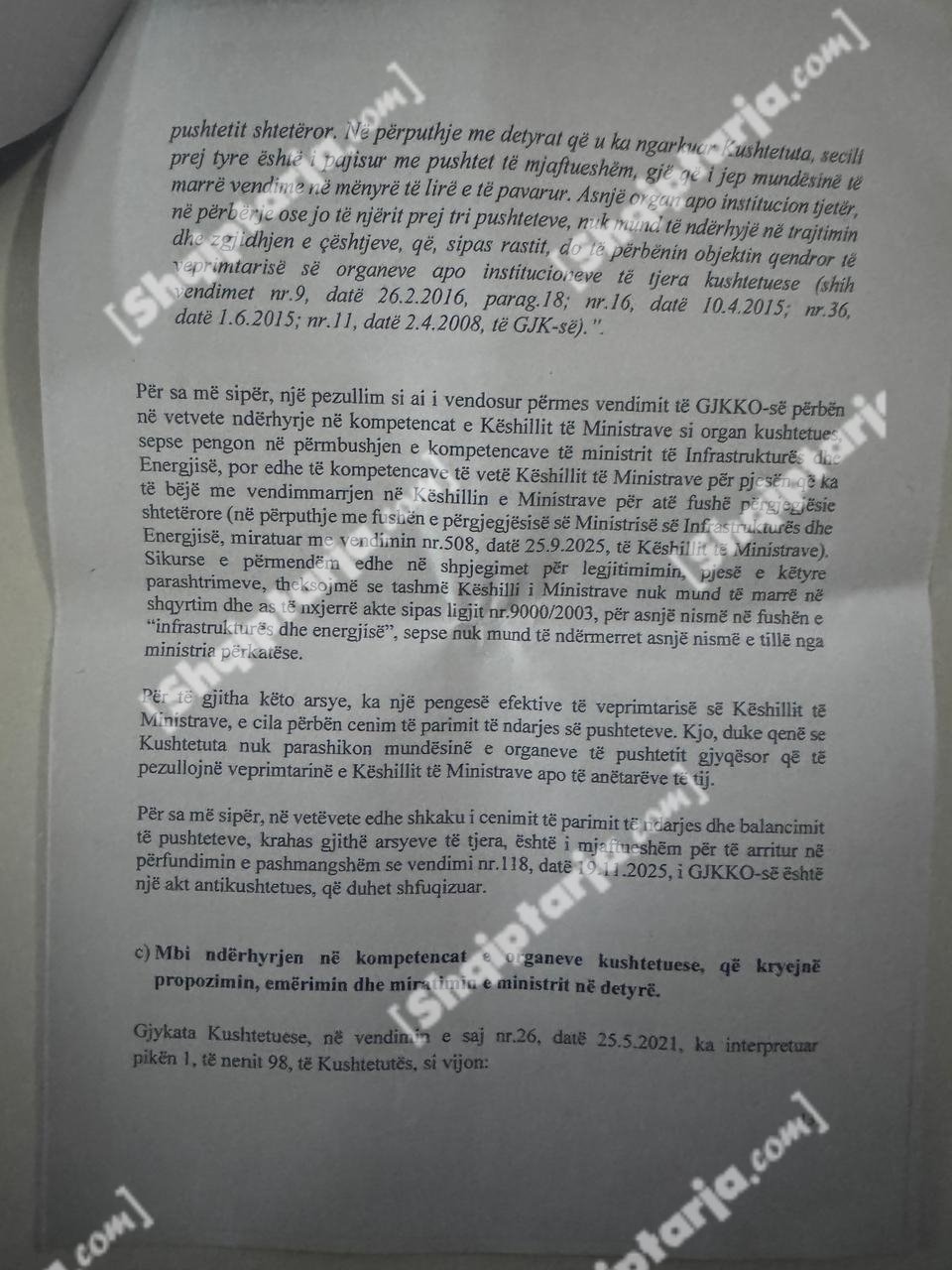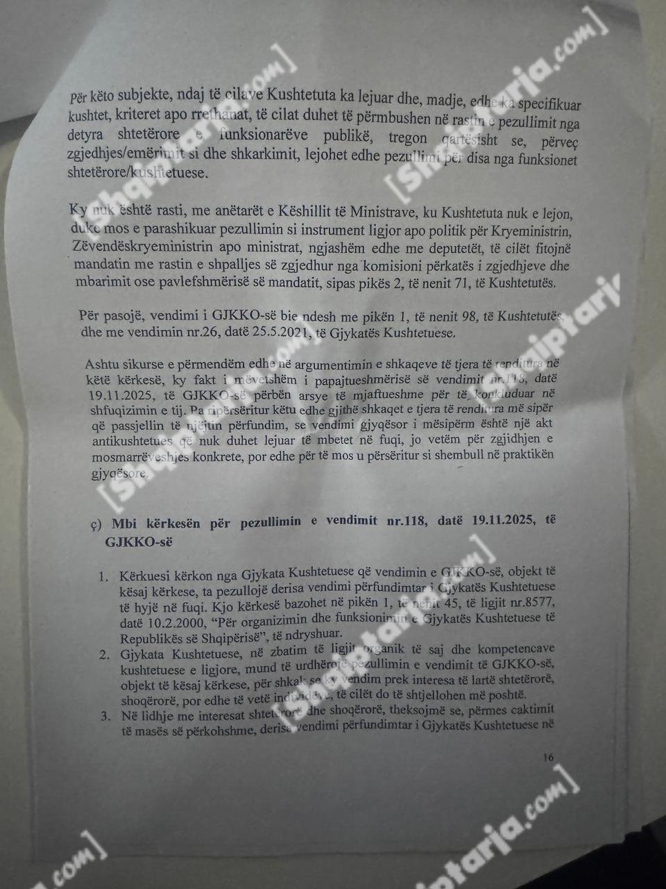 Qeveria argumenton se ky vendim cenon kompetencat e tre institucioneve kushtetuese: Kryeministrit, Presidentit dhe Kuvendit.