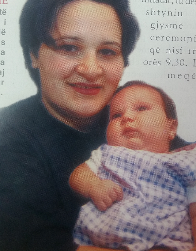 Monika Kryemadhi duke pozuar me foshnjën e sapolindur, pak pas celebrimit 1998