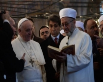 Lutje në xhaminë Sulltan AhmetPapa Françesku ka bërë një lutje të veçantë në xhaminë Sulltan Ahmet, në krah të myftiut të Madh të Stambollit, në ditën e dytë të vizitës së tij 3 ditore në Turqi. Kreu i Vatikanit uli kokën dhe me duart mbledhur u lut në heshtje për gati 3 minuta, në një gjest të harmonisë fetare që zëdhënësi i Vatikanit e përshkoi si ‘një moment të përbashkët adhurimi’ të Perëndisë.