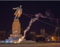 statujën e Leninit në KharkivDemonstruesit në Kharkiv, qytetin lindor të Ukrainës, rrëzuan një nga statujat më të mëdha të vendit, atë të Vladimir Lenin. Monumenti 20 metërsh i idhullit sovjetik, u sulmua nga turmat e protestuesve në Sheshin e Lirisë, të cilët e rrëzuan shtatoren në tokë duke e tërhequr me litarë.