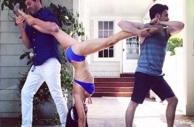 11 Gusht 2014, 11:21Jogat e Hilaria Baldwin po bëhen çdo ditë e më të rrezikshme. Sot ajo ka ndarë me miqtë jogën e ditës ku duket me këmbët në ajër dhe dy meshkuj që po i tërheqin këpucët në drejtime të ndryshme.