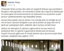 nga ceremonia në SrebrenicëZëvendëskryeministri dhe ministri i Jashtëm i Kosovës, Hashim Thaçi, nuk ka qenë i pranishëm gjatë ceremonisë përkujtimore në Srebrenicë, pasi nuk është lejuar të udhëtojë për tek vendi ku është bërë masakra 20 vjet më parë.