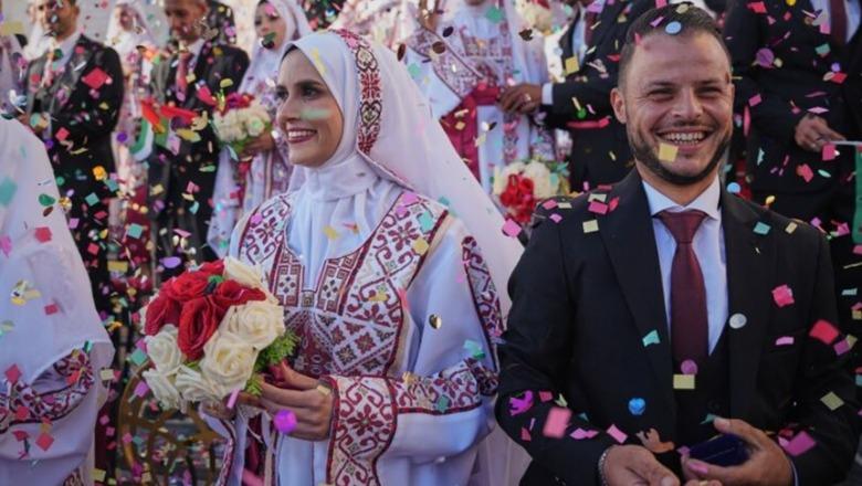 Gaza/ Me flamuj palestinezë dhe motive tradicionale, 54 çifte lidhin kurorë në një ceremoni masive mes rrënojave të luftës (VIDEO)