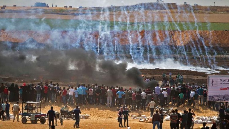 15 Maj 2018, 09:32Dhjetëra mijëra palestinezë u afruan pranë rrjetës kufitare, ku disa prej tyre tentuan ta çajnë. Forcat izraelite në kufi përdorën gaz lotsjellës dhe qëlluan me snajper ndja turmave.