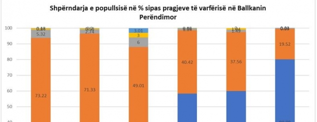 Rreth 80 për qind e popullsisë së Shqipërisë jeton me më pak se 10 dollarë në ditë. Sipas portalit Our World in Data, i cili ka përpunuar të dhënat e Bankës Botërore, për shpërndarjen e popullsisë sipas pragjeve të ndryshme të varfërisë, vetëm 20.44 për qind e popullsisë jetonin me mbi 10 dollarë në ditë, pjesa tjetër, 79.56 për qind jetonte me më pak se 10 dollarë në ditë.