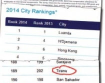 Shtrenjtohet jetesa në TiranëTë jetosh në Tiranë në vitin 2014 paraqet më shumë vështirësi financiare se një vit më parë. Këtë e zbulon një raport i shoqërisë nga Nju Jorku, të specializuar në vlerësime dhe këshillime lidhur me kapitalin njerëzor dhe investimet, “Mercer”.