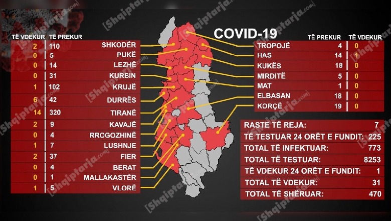 30 Prill 2020, 10:59Numri i pacientëve të shëruar është dyfish më i lartë se i të infektuarve. Janë konfirmuar 7 raste pozitive, nga të cilat 3 në Krujë, 2 në Tiranë dhe 2 në Shkodër duke çuar në total numrin e të prekurve në 773 raste.