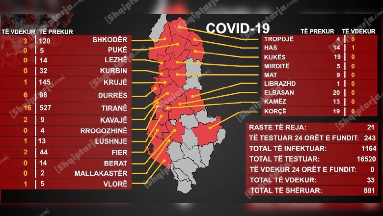 2 Qershor 2020, 10:30Koronavirusi është shtrirë në disa vatra të reja në Shqipëri, e ndërsa në 24 orët e fundit janë konfirmuar 21 raste, nga të cilët 6 janë personel mjekësor. Këto shifra kanë dalë si rezultat i 243 testimeve të kryera, mes tyre 45 personel shëndetësor. Tirana vijon të jetë epiqendra e këtij virusi ku janë shënuar 14 rastet e reja për t'u ndjekur nga Kruja me 3 raste, ndërsa në Durrës, Shkodër, Kamëz, Mallakastër janë konfirmuar nga 1 rast.