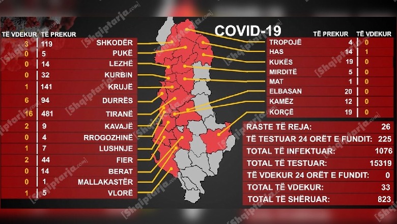 28 Maj 2020, 10:59Ministria e Shëndetësisë: 26 raste të reja në Tiranë, asnjë rast në zonat e tjera. QSUT vijon që të jetë vatra e nxehtë. Në spitalin infektiv aktualisht po trajtohen 24 pacientë, nga të cilët 3 janë në terapi intensive. Mbi 76% e të infektuarve janë të shëruar. Në vendin tonë aktualisht janë 220 persona aktivë me COVID19, kryesisht ne Tiranë, Durrës dhe Krujë.