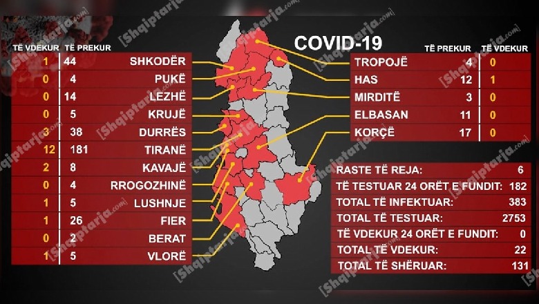 Regjistrohet numri më i ulët i rasteve të reja në 2 javët e fundit në Shqipëri! Nga 182 teste në 24 orë, vetëm 6 pozitiv me COVID-19 (383 në total)