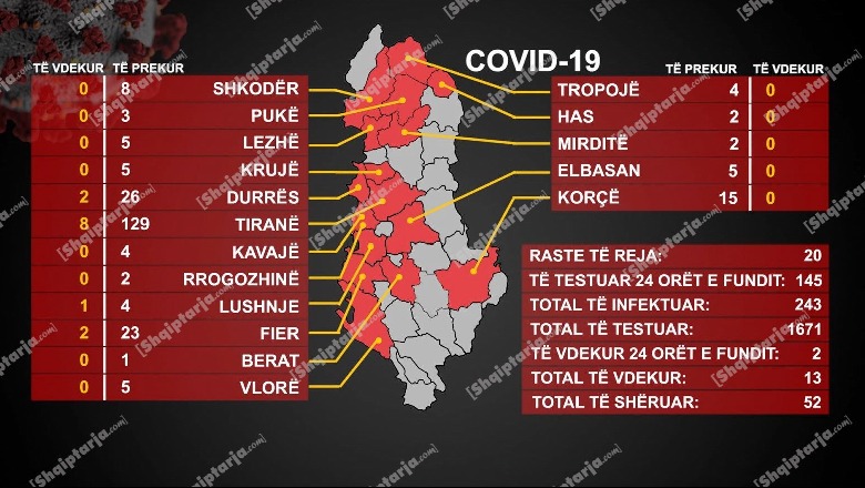 13 viktima me koronavirus! 243 të prekur me COVID- 19 në total (20 raste të reja sot)! 'Shpërthen' virusi në Durrës