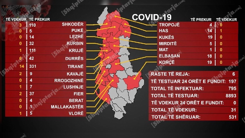 Kruja vatra më e madhe aktive e infeksionit, ndiqet nga Tirana! 6 raste të reja sot, 67% e të prekurve janë shëruar