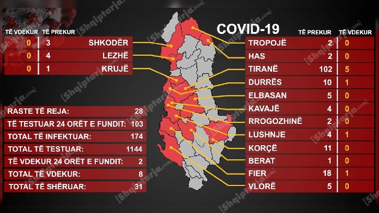 8 viktima me koronavirus në Shqipëri/ Pëson infarkt në Spitalin Infektiv 66-vjeçari me sëmundje kronike