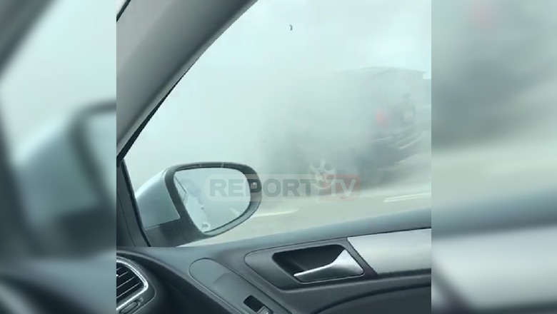 Mjeti përfshihet nga flakët, trafik i rënduar në autostradën Tiranë- Durrës (VIDEO)