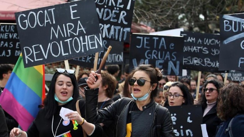 8 Mars 2019, 16:35Në një tubim të mbajtur pranë Drejtorisë së Policisë së Tiranës, shoqëria civile kërkoi mbrojtje me efikase për gratë dhe vajzat e dhunuara në vend. Në këtë tubim morën pjesë edhe pjesëtarë të shoqatës së LGBT-së të cilat u prezantuan nën moton "Gocat e mira revoltohen"