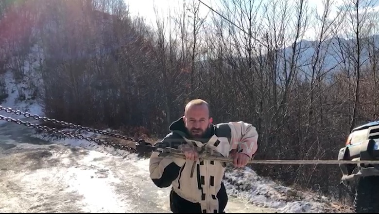 6 Janar 2019, 22:12Ai shihet teksa ka lidhur makinën e tij me një litar, për ta tërhequr dhe për ta nxjerrë nga gremina.