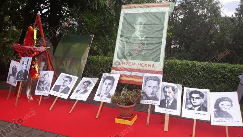 5 Maj 2018, 09:21Disa nostalgjikë të pakët komunistë janë shfaqur me pankarta në nder të diktatorit Enver Hoxha dhe figurave të tjera kyçe të Luftës së Dytë Botërore.