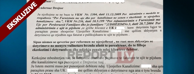 Ndjekje penale dhe largim nga vendi i punës rrezikojnë të gjithë punëonjëist e administratës që rezultojnë debiton tek Ujësjellësi. Report Tv zbardh ekskluzivisht dokumentin dërguar të gjitha institucioneve. Afati i fundit për shlyerjen e detyrimeve ishte data 20 nëntor, pas kësaj ndate do të nisin penalizimet për të gjithë debitorët.