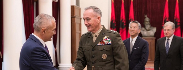 së SHBA: Ndihma për FA, e çmuaPresidenti Ilir Meta ka pritur në një takim të veçantë Shefin e Shtabeve të Bashkuara të SHBA-ve, Gjeneralin Josph Dunford, njofton zyra e shtypit të Presidencës.
