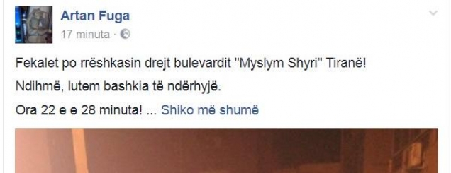 Fuga: Ndihmë, bashkia të ndërhyjëAkademiku Artan Fuga, nëpërmjet një statusi në facebook ka denoncuar bllokimin e një pustete në bulevardin “Myslym Shyri”, gjë e cila sipas Fugës ka bërë që “fekalet të rrëshqasin drejt bulevardit ”.