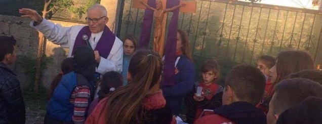 meshën pranë besimtarëveMe një makinë modeste që duket sikur kthesat dhe gropat e mundimshme të periferisë do t’ia ndalin ecjen nga momenti në moment, Don Mikele shkon në çdo shtëpi që e mirëpret.