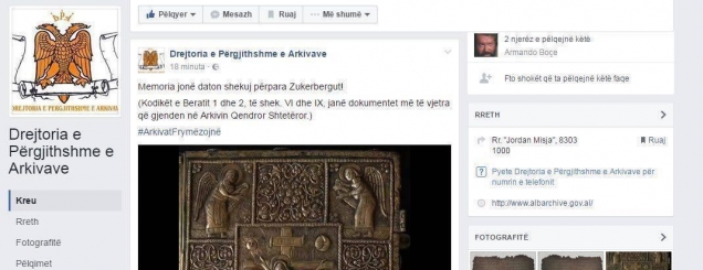jonë, shekuj përpara ZuckerbergDrejtoria e Përgjithshme e Arkivave zgjodhi një mënyrë origjinale për t’u bërë prezente në Facebook. Postimi i parë i Arkivave ishte në fakt një karshillëk ndaj vetë Facebook-ut. "Memoria jonë daton shekuj përpara Zukerbergut!”, shoqëruar nga fotografi të Kodikut të Beratit të shekullit të gjashtë.