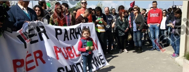 e vogël proteston kundër parkutAktivistë të shoqërisë civile kanë zgjedhur një simbolikë të fortë për të shprehur kundërshtinë e tyre ndaj projektit për të ndërtuar kënd lojërash në parkun e gjelbër të Liqenit Artificial në Tiranë. Një fëmijë kryeson protestën e tyre para Bashkisë së Tiranës