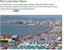Shqipëria një tokë pa të ardhmeNë Shqipëri nuk ka luftë, nuk ka uri. Modelet e Mercedezave udhëtojnë përmes qyteteve të mëdha dhe jugu duket si Riviera franceze. Atëherë pse ikin shqiptarët? Kështu e nis reportazhin e saj gazetarja Anna Prizkau, publikuar sot në të përditshmen gjermane Frankfurter Allgemeine të titulluar një tokë pa të ardhme.