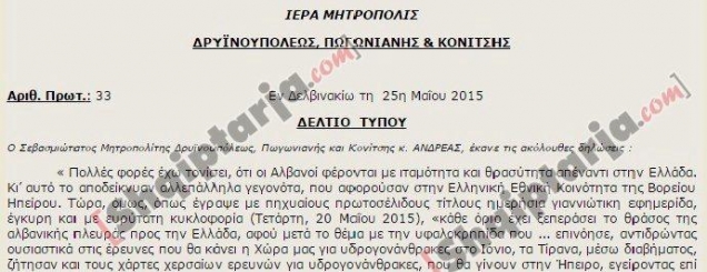 "Zgjohuni kundër shqiptarëve"Mitropoliti grek Andreas vazhdon të provokojë me qëndrimet e tij publike anti-shqiptare. Brenda pak ditësh një nga krerët e Kishës zyrtare të Greqisë, Mitropoliti i Drinopoleos, Pogonit e Konicës, siç është titulli i tij zyrtar, ka lëshuar një deklaratë të re kundër Shqipërisë.