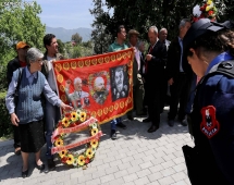 për Dëshmorët, me simbolet e HoxhësMbajtja e simboleve komuniste siç është fotoja e ish-diktatorit Enver Hoxha, ka bërë që policia të mos lejojë bashkimin e Partisë Komuniste në ceremoninë tek Varrezat e Dëshmorëve në përkujtim të të rënëve të luftës Antifashiste Nacional Çlirimtare.