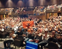 sallës së konferencave në SHBAFlamuri shqiptarë dhe simboli i shqiponjës bëhet pjesë e një salle konferençash në Shtetet e Bashkuara të Amerikës