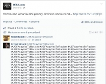 Protesta në rrjet ndaj verdiktitPak orë pas publikimit të verdiktit të UEFA-s mbi ndeshjen e shumë përfolur Serbi – Shqipëri, sportdashësit nga të gjitha trevat shqiptare kanë protestuar dhe në masë në facebook. Më konkretisht në faqen zyrtare të UEFA-s, postimi ku njoftohet vendimi mbi këtë ndeshje është bombarduar me mijëra komente me ashtagun “#UEFAsayYesToRacism” (UEFA thuaji Po Racizmit).