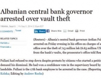5 Shtator 2014, 22:45Mediat ndërkombëtare kanë pasqyruar në kohë rekord arrestimin e guvernatorit të Bankës së Shqipërisë, Ardian Fullani. Agjencia e lajmeve “Reuters” ka publikuar mbrëmjen e vonë të së premtes lajmin e arrestimit të kreut të BSH në zyrën e tij, me akuzën për shpërdorim detyre gjatë vjedhjes së supozuar të 6.63 milion dollarëve të grabitura nga thesari i Bankës.