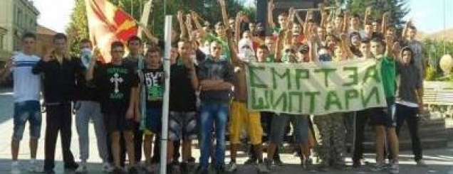 "Vdekje për shqiptarët"Si kundërpërgjigje e protestave të shqiptarëve të cilët po kërkojnë drejtësi, një grup i të rinjve maqedonas ka protestuar ndërsa mbanin në duar parrullën “Vdekje për shqiptarët”.