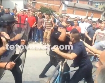 forcave të policisë, i godet me grushteNë mesin e qindra protestuesve që qëndronin përpara bllokadës së polciisë, e të tjerë filmonin, një person ka zgjedhur të konfrontohej ballë për ballë me policinë maqedonase.